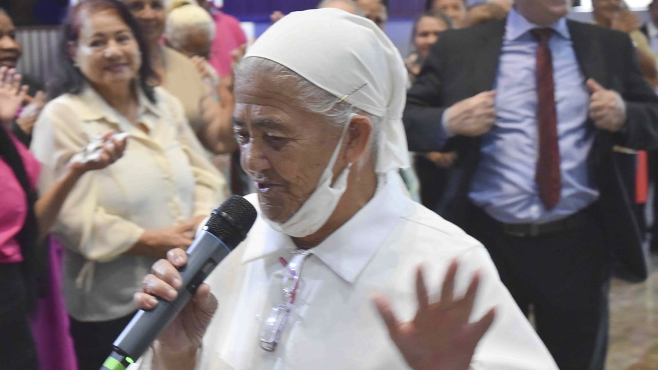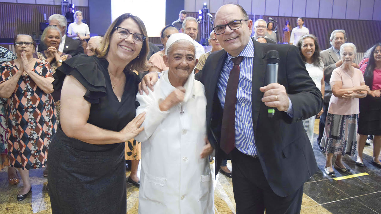 Um momento verdadeiramente especial ocorreu no encerramento do culto de Santa Ceia, quando a evangelista Maria Prates, uma das pioneiras da nossa Catedral, com seus abençoados 102 anos de idade, nos conduziu em uma poderosa oração.